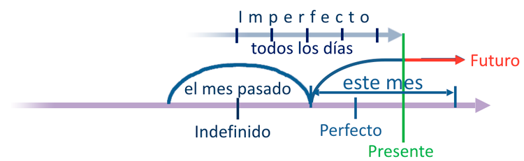 Иногда, чтобы легче понять структуру испанских времён, бывает полезным нарисовать их, уложив в одну схему.