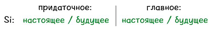 !!! Таким образом, в первом типе не используются времена Subjuntivo ни в главном, ни в придаточном предложениях (после si). Будущие времена не использутся только в придаточном предложении (после si).
